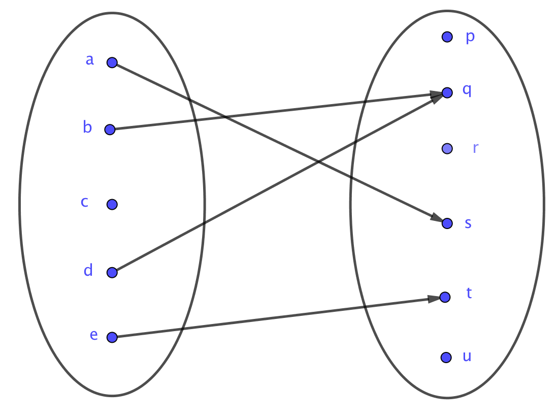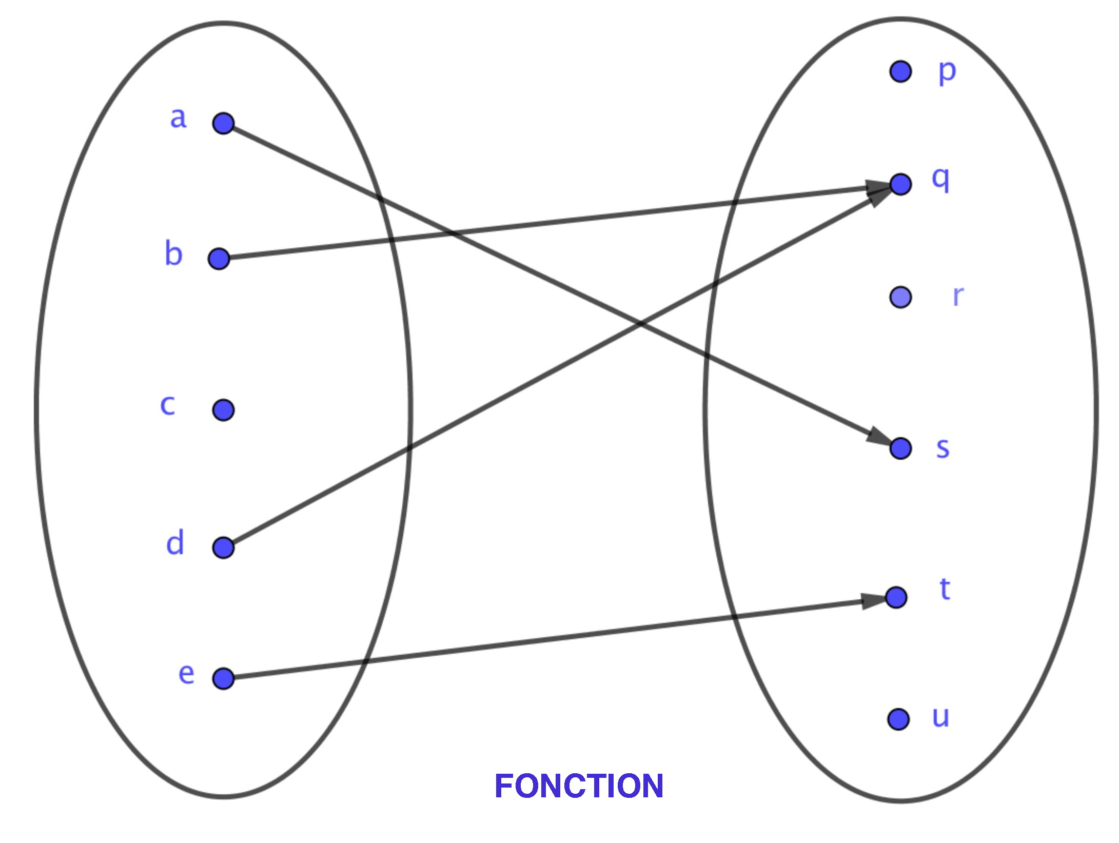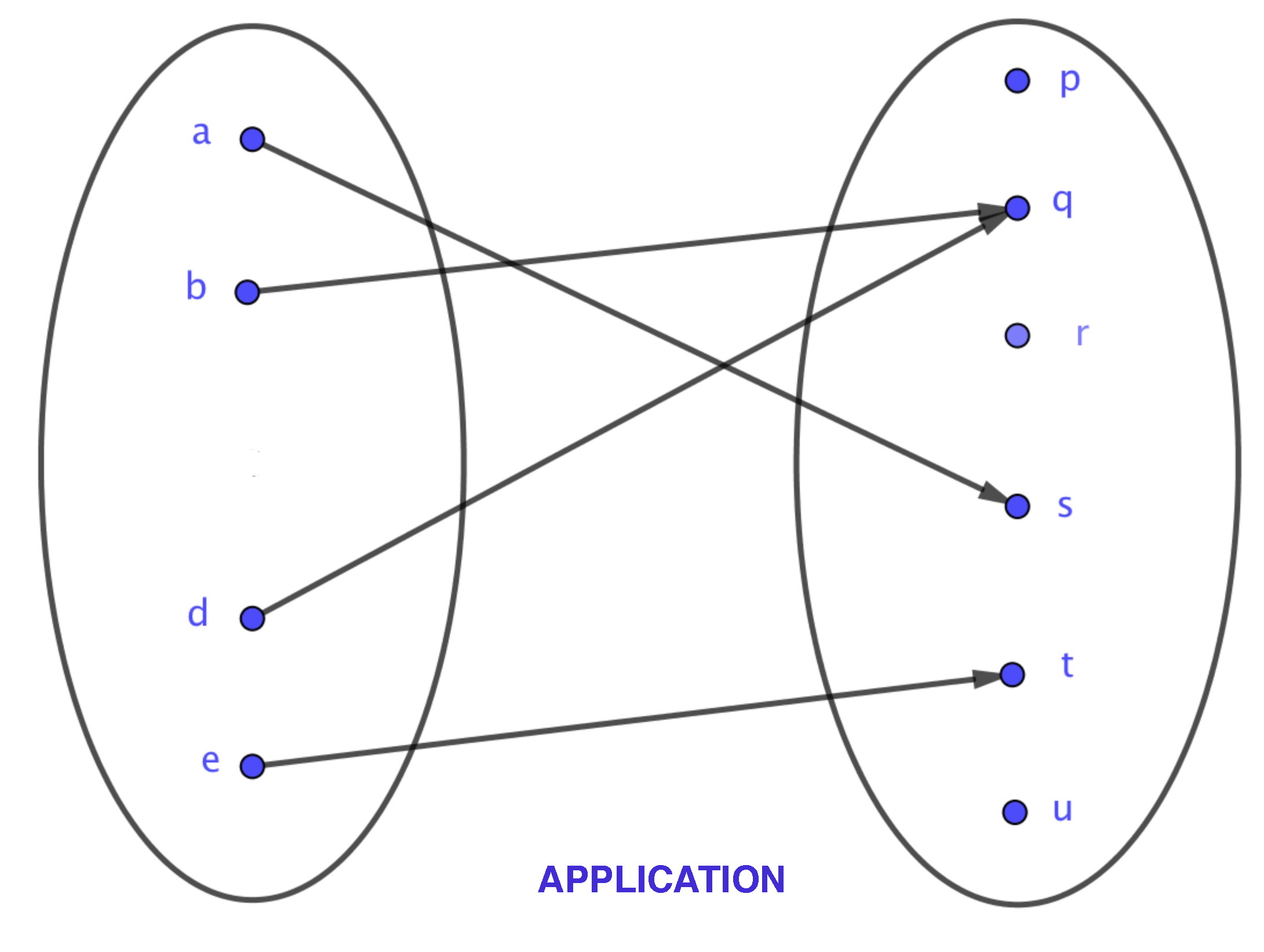 Dans l'exemple défini par Tableau, Diagramme sagittal , la fonction f de E={a,b,c,d,e} vers F={p,q,r,s,t,u} devient une application si l'on prend pour ensemble de départ E={a,b,d,e} ( son ensemble de définition).