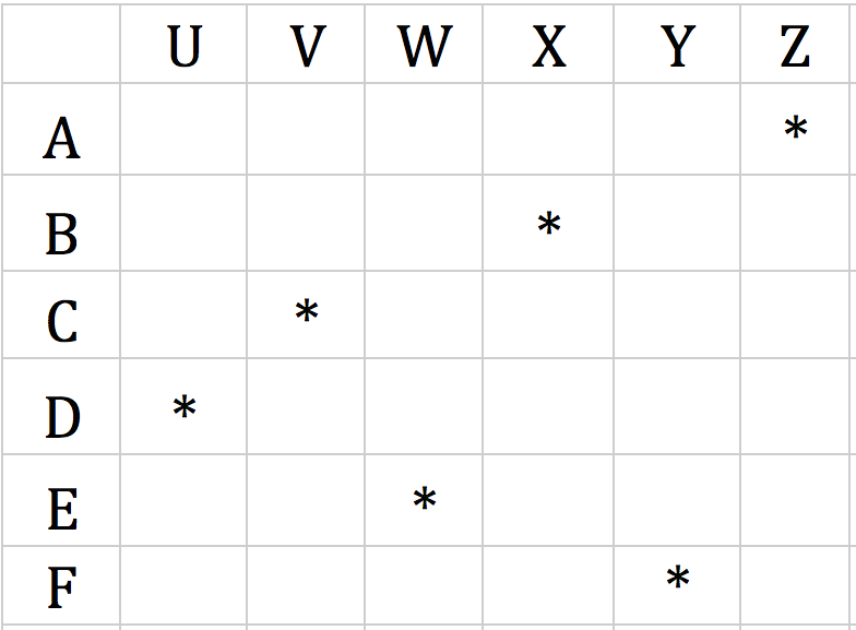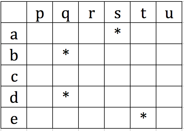 Le tableau ci-dessous représente une fonction f de E={a,b,c,d,e} vers F={p,q,r,s,t,u}. Ainsi a a pour image s par f (ce que l'on a matérialisé par une étoile ici), b a pour image q, etc..., et c n'a pas d'image.